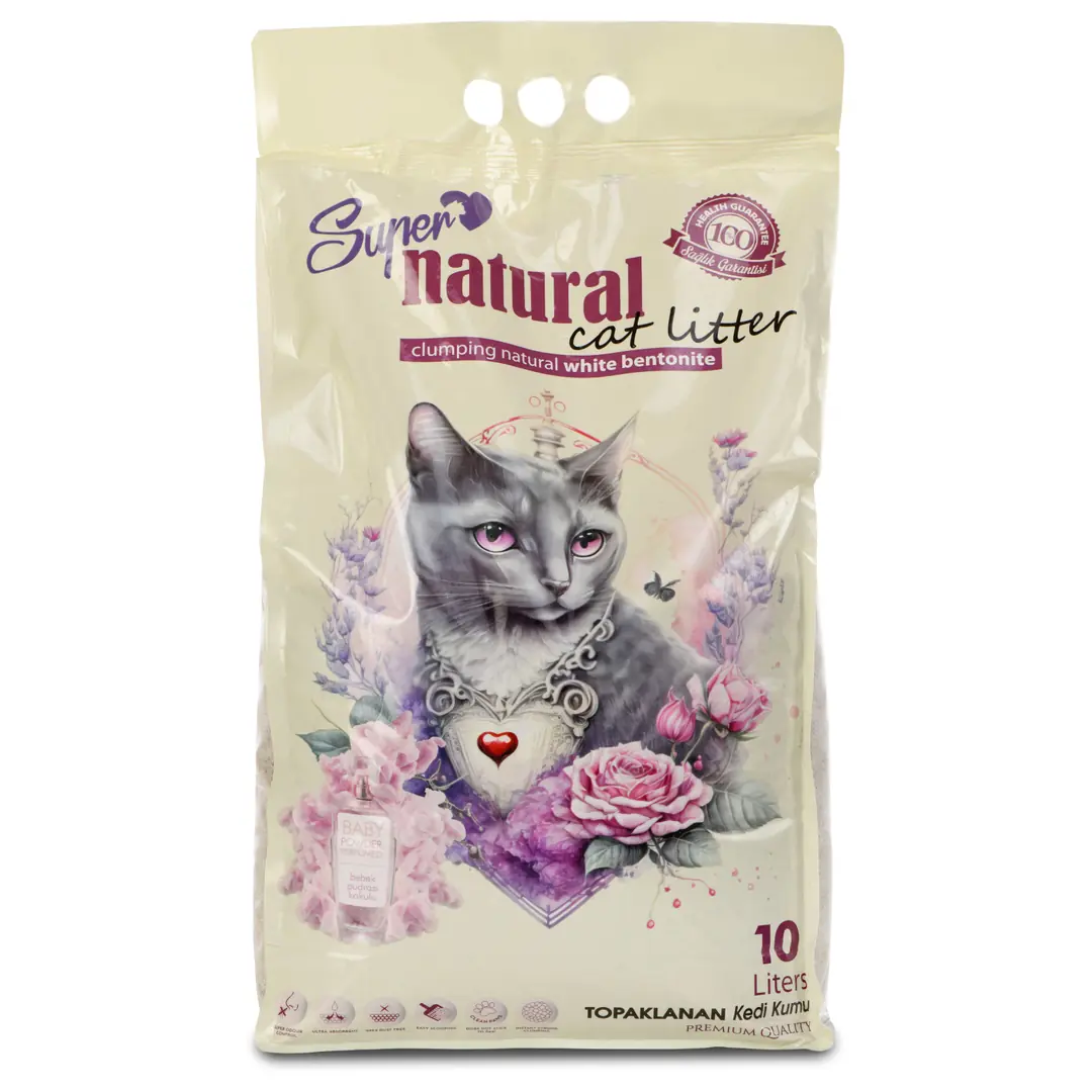 Çiçek kokulu, topaklaşan doğal beyaz bentonit kedi kumu. Bebek pudrası kokusu ile evinizi taze tutar.